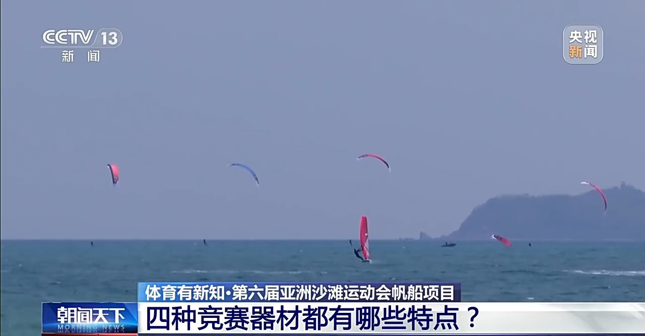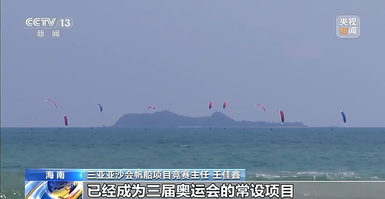 总台央视记者 杜思源:三亚亚沙会的帆船比赛,共有八个小项,选手们使用的是四种不同的器材,我们现在在海面上就能看到这些器材。它们分别是水翼风筝板、水翼帆板,还有两种不同级别的帆船。所有的器材,在比赛中都是由一位选手独自驾驶。