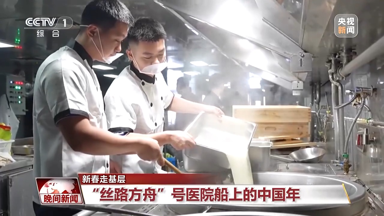虽然远离祖国13个时区,但是医院船上处处洋溢着团圆喜庆的氛围。除夕当晚,医院船的餐厅张灯结彩、年味十足,热气腾腾的年夜饭正式上桌。